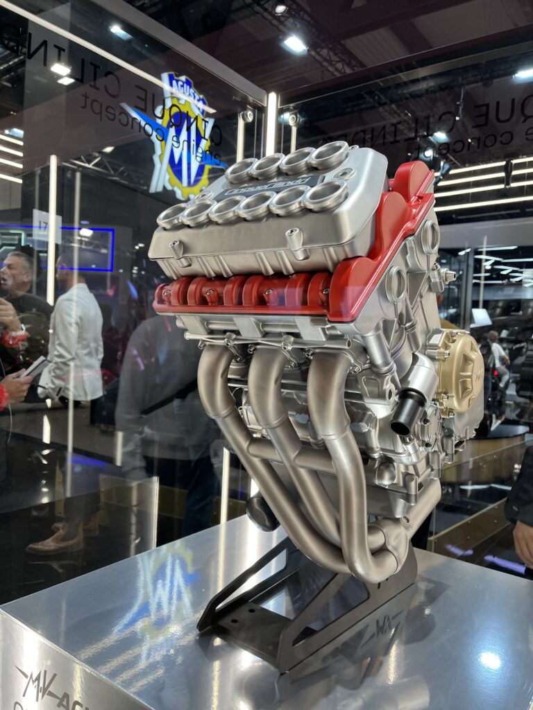 MV Agusta ha sempre rappresentato l’eccellenza e l’esclusività, e EICMA 2025 non ha fatto eccezione. La Casa di Varese ha svelato un motore concettuale a **5 cilindri a V** di circa 1000cc, che ha catturato l’attenzione di tutti gli addetti ai lavori. La sua peculiarità non è solo il numero di cilindri, ma la configurazione: non una classica “V”, bensì un design con un albero motore per ogni fila di cilindri, definito “quadrato” per analogia con i leggendari 4 cilindri 500 2 tempi da Gran Premio degli anni ’70, come la Suzuki RG 500 del 1974. Un’innovazione che strizza l’occhio alla storia gloriosa del racing, promettendo un’erogazione unica e un sound inconfondibile, segno che MV Agusta continua a esplorare soluzioni estreme per le sue future moto, come le attese **Brutale 950** e **Enduro Veloce**.